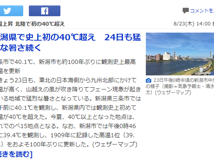 皆様こんにちわ。 ここ新潟県三条市よりお届けしております、イチパン小林でございます。 Yahoo!ニュースに、新潟の文字が踊りましたね! 40.1℃って…………… 風はある、風があるからまだいいのか?と思いきや、熱風が吹くから、今日はわが社、玄関の風除室から廊下の窓まできっ...
