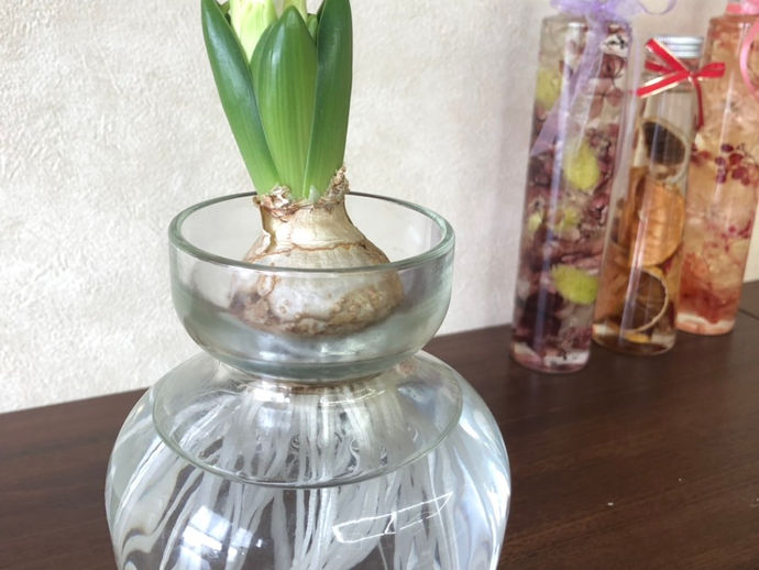 こんにちわ!燕三条発、イチパン小林です(^o^)/ 一昨年に引き続き、昨年末も、生徒さんがステキなフラワーベースにヒヤシンスの球根を入れて持ってきてくださいました! グリーン関係にめっぽう弱い我々スタッフのために、ある程度根が出てから持ってきて下さって、お花が終わったら引き...